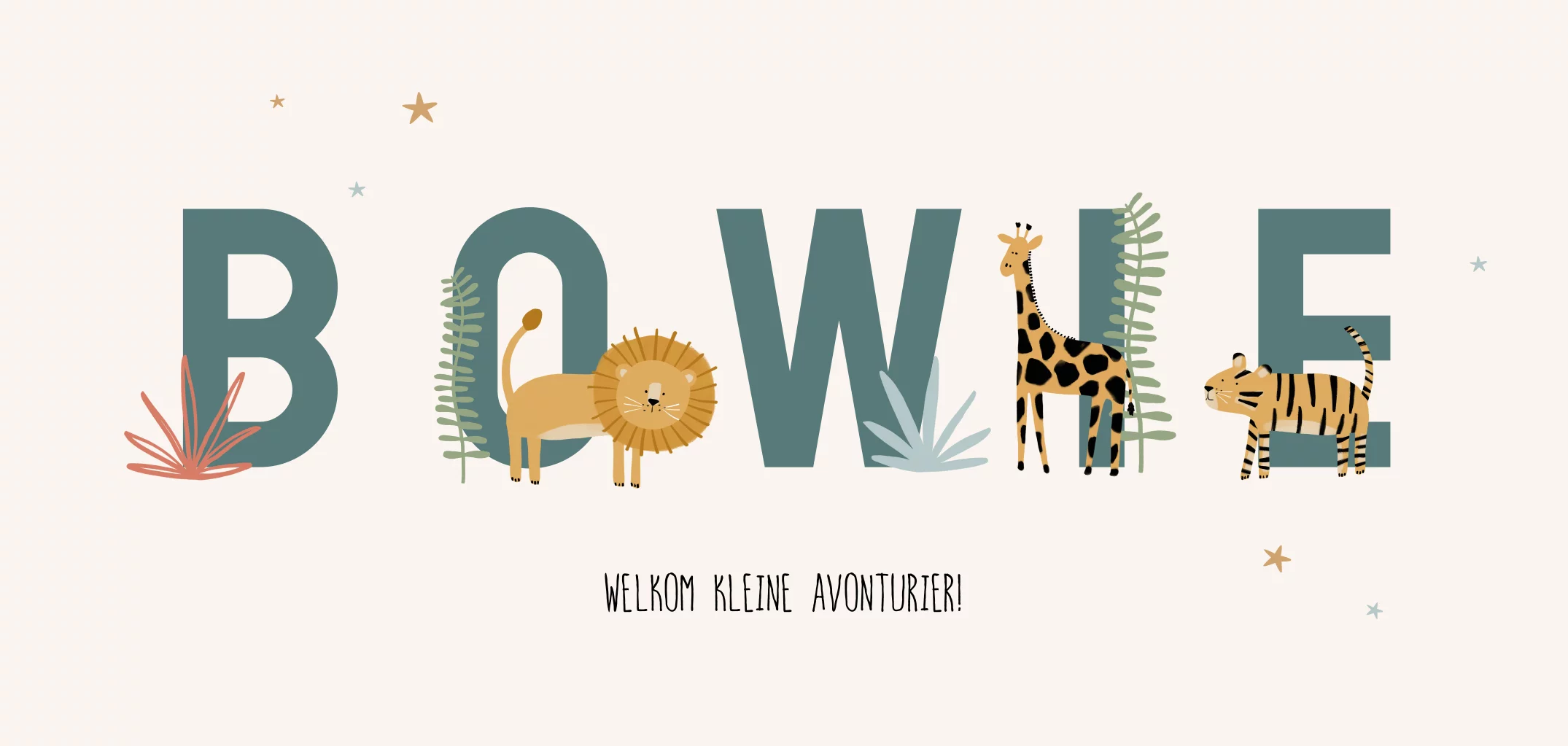 Dit is een stoer geboortekaartje voor jullie zoon of dochter. Centraal op het kaartje wordt de naam van jullie kleintje in hoofdletters gedrukt. Een leeuw, giraffe en tijger komen achter de letters vandaan. Pas het kaartje naar wens aan in onze online editor en bestel snel een proefdruk om dit kaartje in het echt te zien!