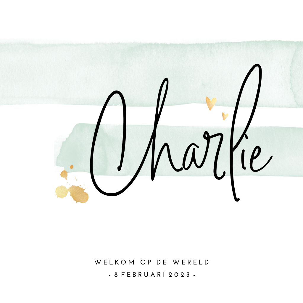 Hip babykaartje met mint groene strepen van watercolour, goudkleurige hartjes en verfspatten. De naam van jullie kindje is geschreven in mooie sierlijke letters.