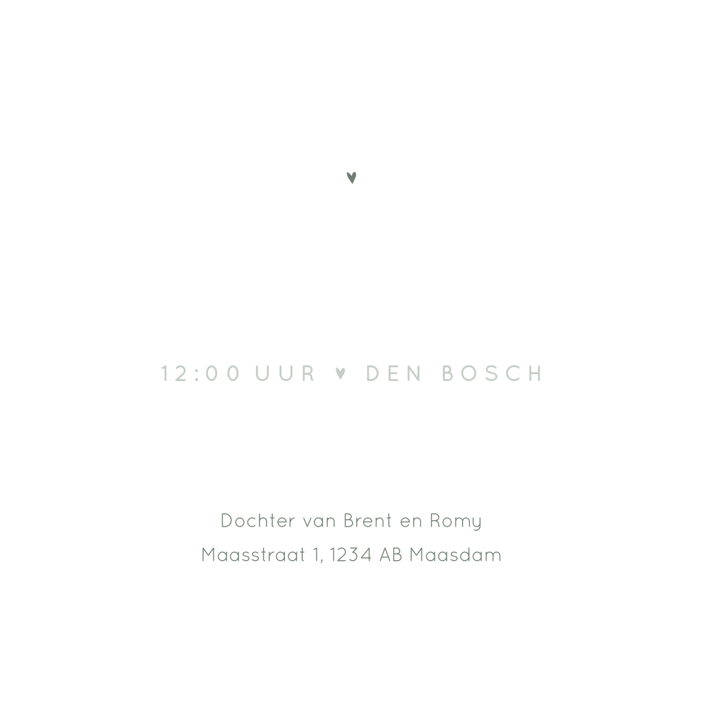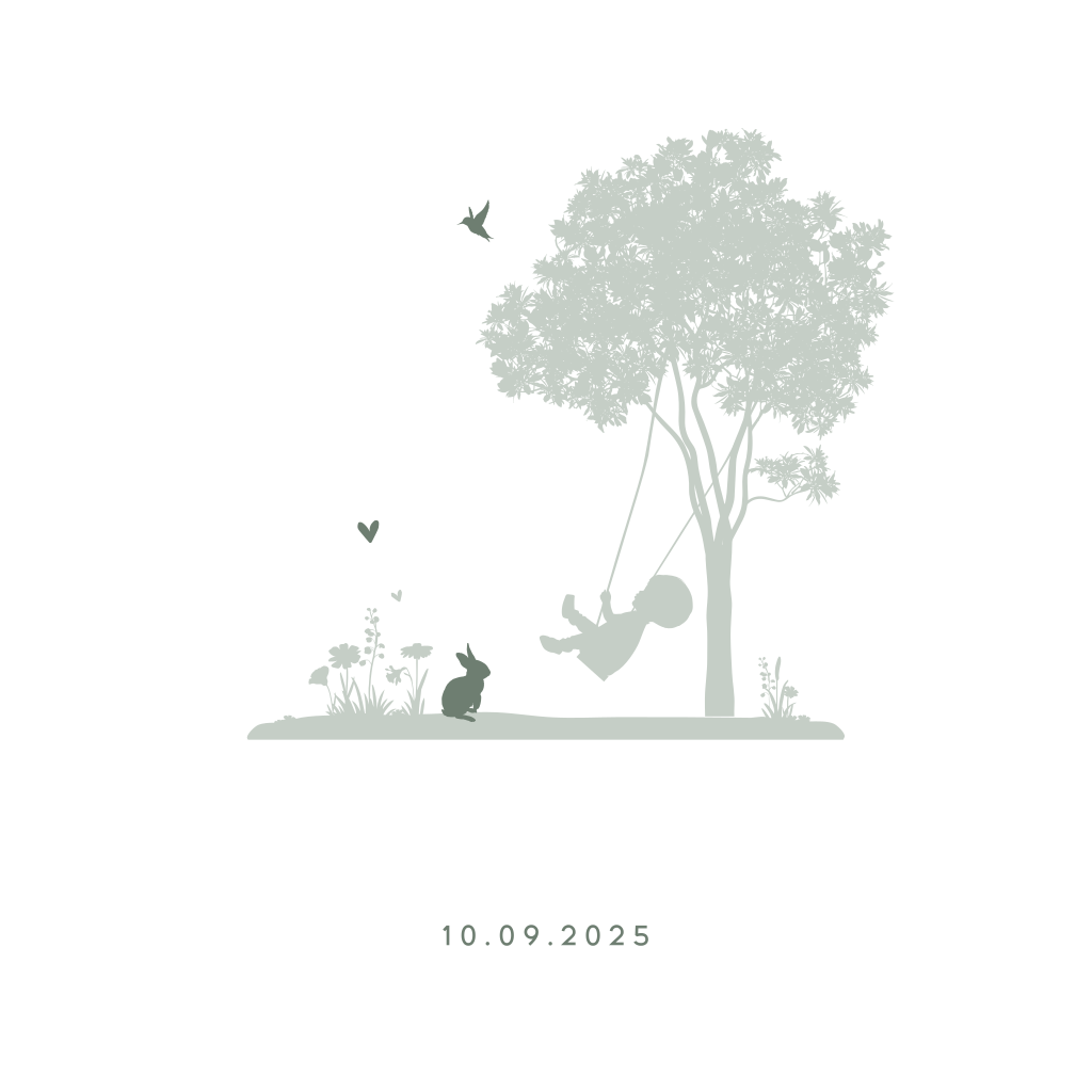 Dit is een lieve kaart voor jullie pasgeboren zoon. Centraal op het kaartje staat het silhouet van een jongen op een schommel. De naam wordt gedrukt in goudfolie en geeft een luxe effect. Het konijntje, het kleine vogeltje en de hartjes maken dit kaartje helemaal compleet.