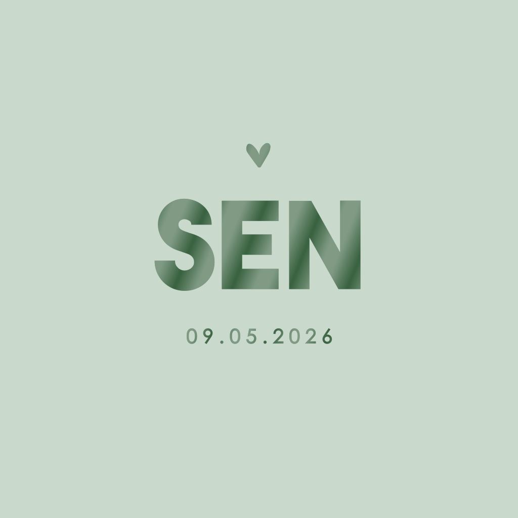 Een hip en minimalistisch geboortekaartje voor jouw kindje. Het kaartje heeft een groene achtergrond kleur met daarop donkergroene hoogglans letters. De kaart is volledig te personaliseren in onze online editor.