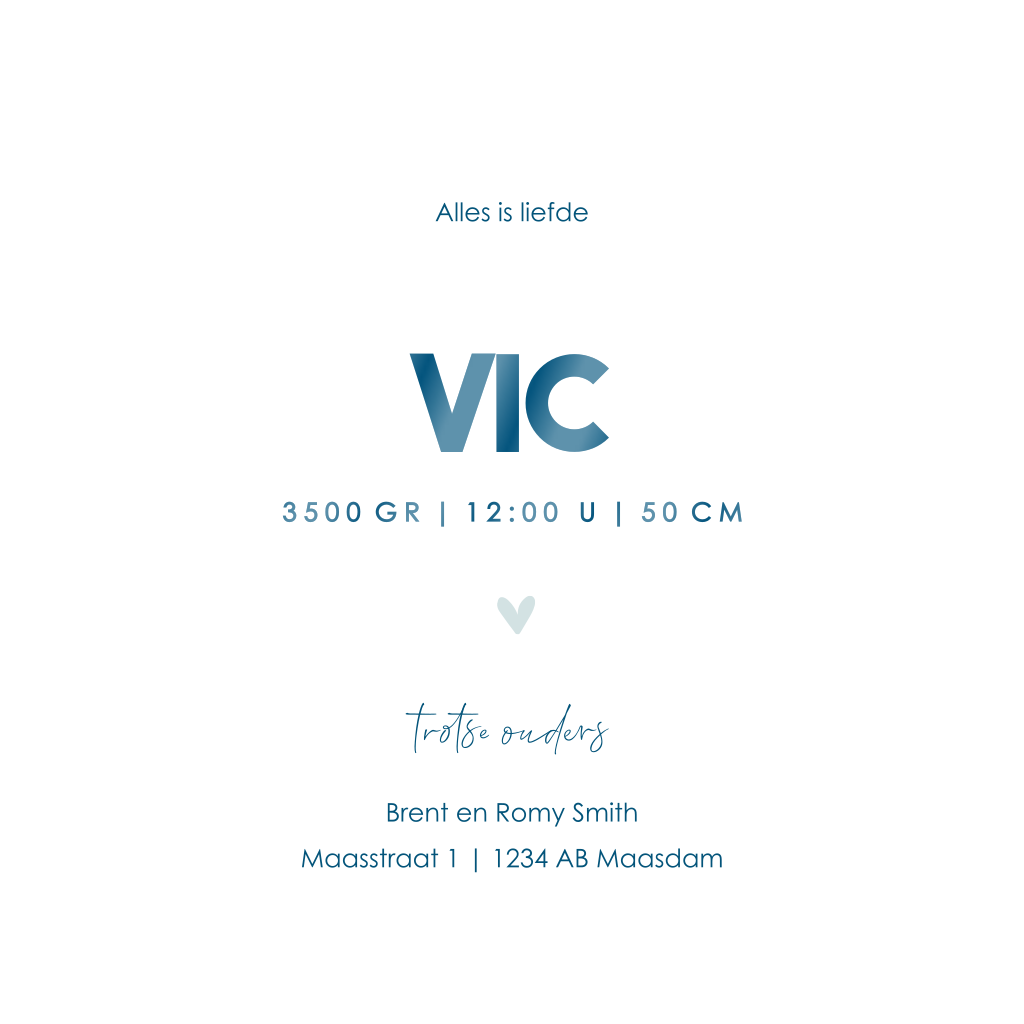 Hip blauw geboortekaartje voor jongen met hartje en hoogglans