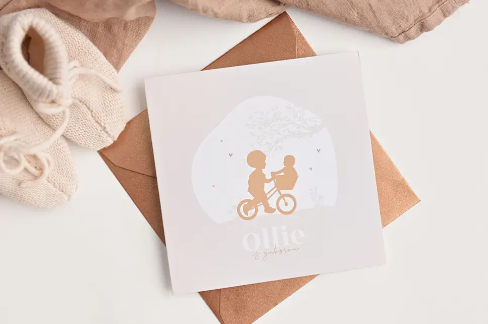 Lief hoogglans geboortekaartje met silhouetjes op een fiets