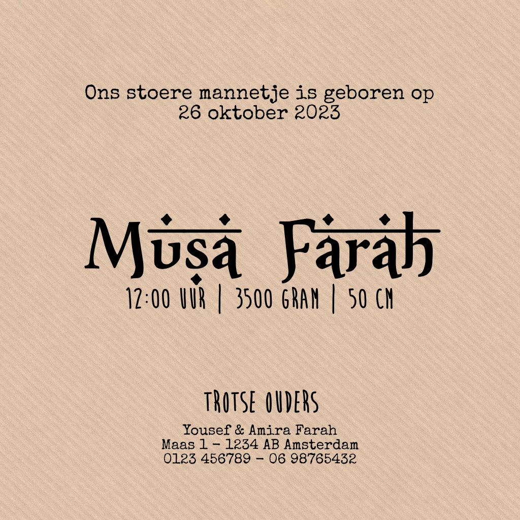 Hip geboortekaartje voor je zoon met een silhouet van een eend, olifantje en giraffe in koperlook op een kraft papier achtergrond. De stoere arabische lettertype maakt de geboortekaart helemaal af!