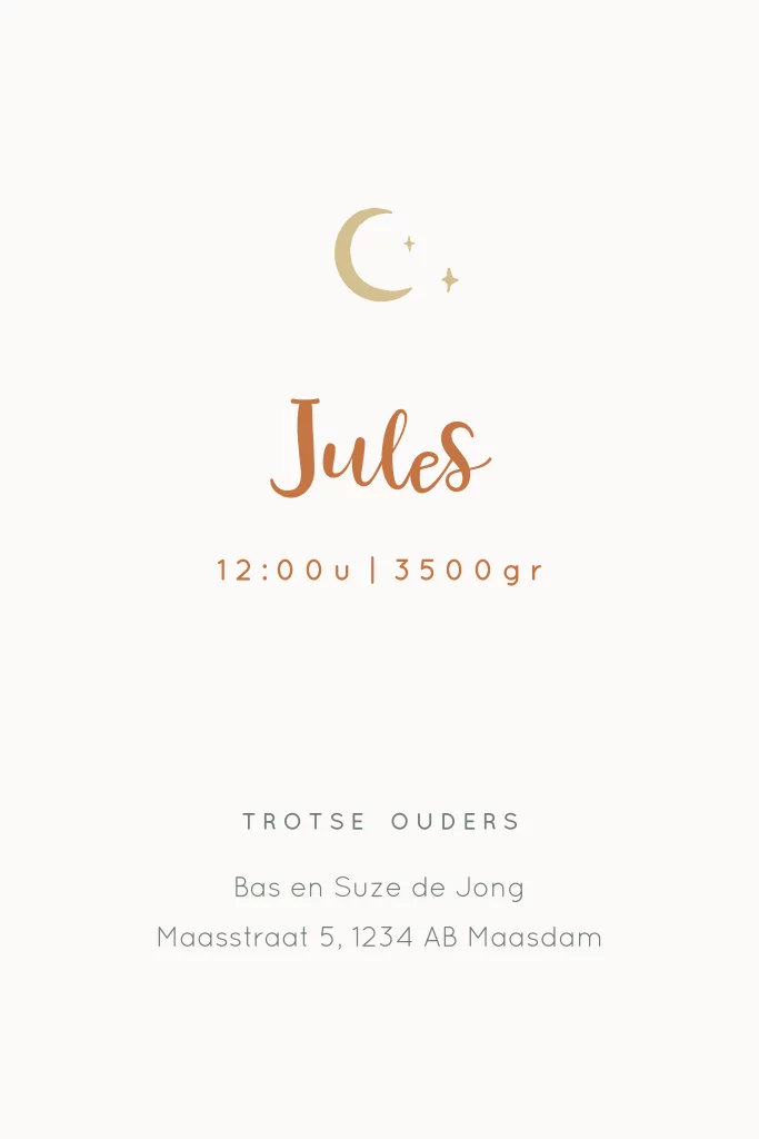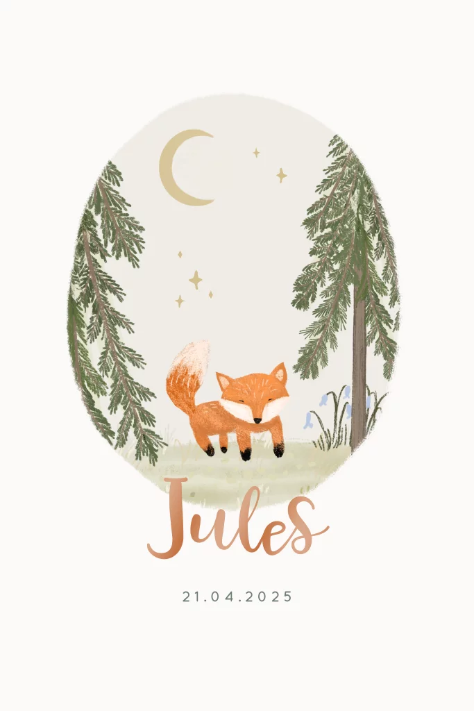 Dit is een lief geboortekaartje voor jullie zoon. Op het kaartje is de tekening van een vosje in het bos te zien met kleine sterretjes en een maantje in de lucht. De naam wordt gedrukt in hoogglans en geeft dit kaartje een luxe uitstraling. Benieuwd naar dit kaartje? Bestel het kaartje en bewonder het kaartje in het echt!