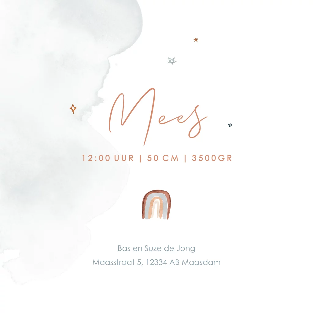 Dit is een mooi geboortekaartje voor jullie zoon. Centraal op het kaartje is een watercolour regenboog te zien. De naam wordt gedrukt in hoogglans waardoor dit kaartje een luxe uitstraling krijgt. Benieuwd naar dit kaartje? Bestel een proefdruk en bewonder dit kaartje in het echt.