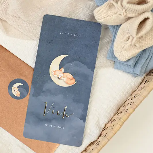 Wat een lief geboortekaartje voor jouw kindje. Het kaartje heeft een donkerblauwe achtergrond met daarop wolkjes en een vosje slapend op de maan. De naam wordt gedrukt in goudfolie.