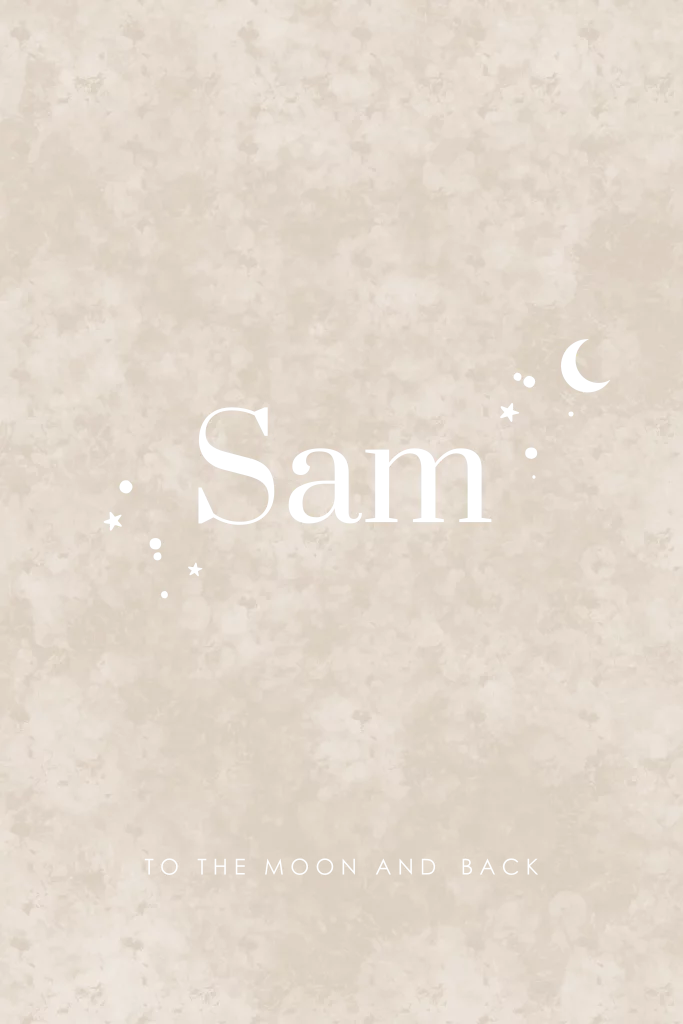 Een stijlvol geboortekaartje voor jouw kindje. Het kaartje heeft een prachtige beige velvet-look achtergrond. Op de voorkant lees je de naam in goudfolie omringd door goudfolie sterren en maantje. Pas het ontwerp naar wens aan.