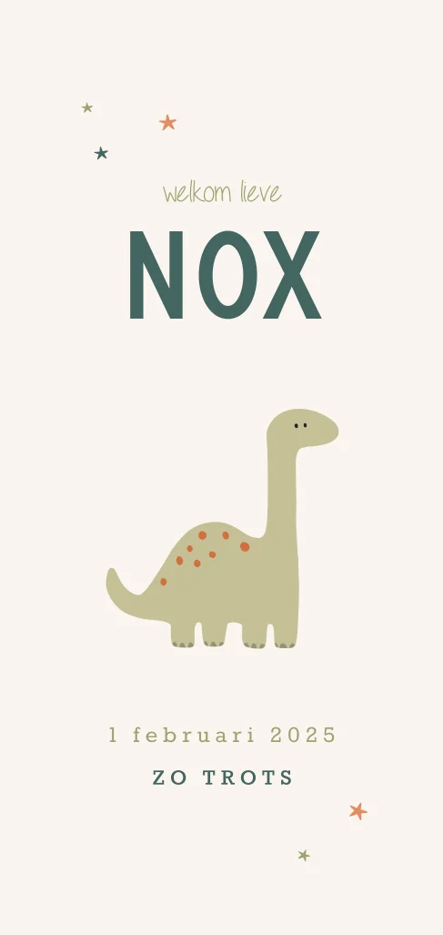 Kondig de geboorte van jullie zoontje aan met dit kaartje. Op het kaartje is de tekening van een groene dino te zien. De kleine sterretjes maken dit kaartje helemaal af. Benieuwd naar dit kaartje? Pas het kaartje aan in onze online editor en bestel een proefdruk.