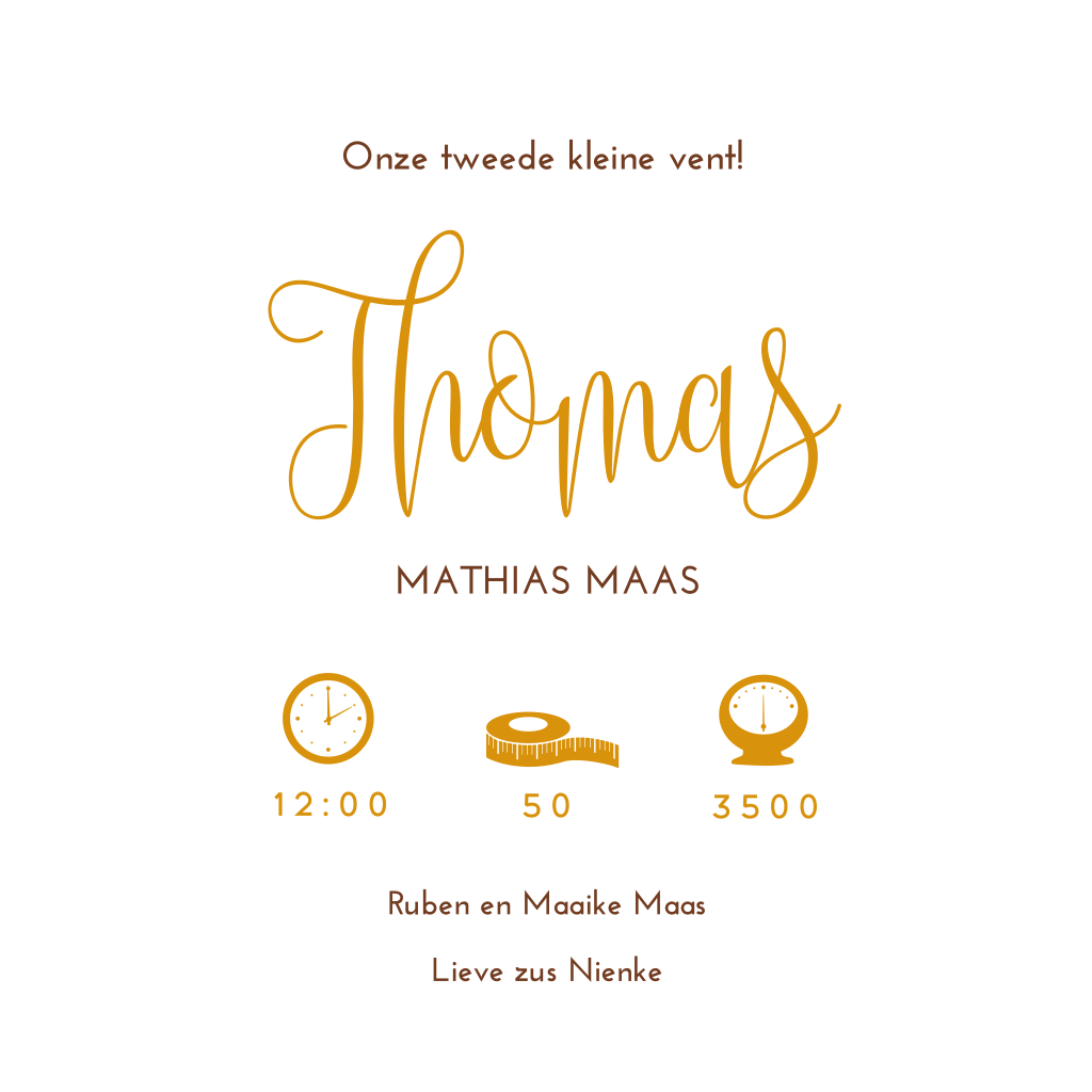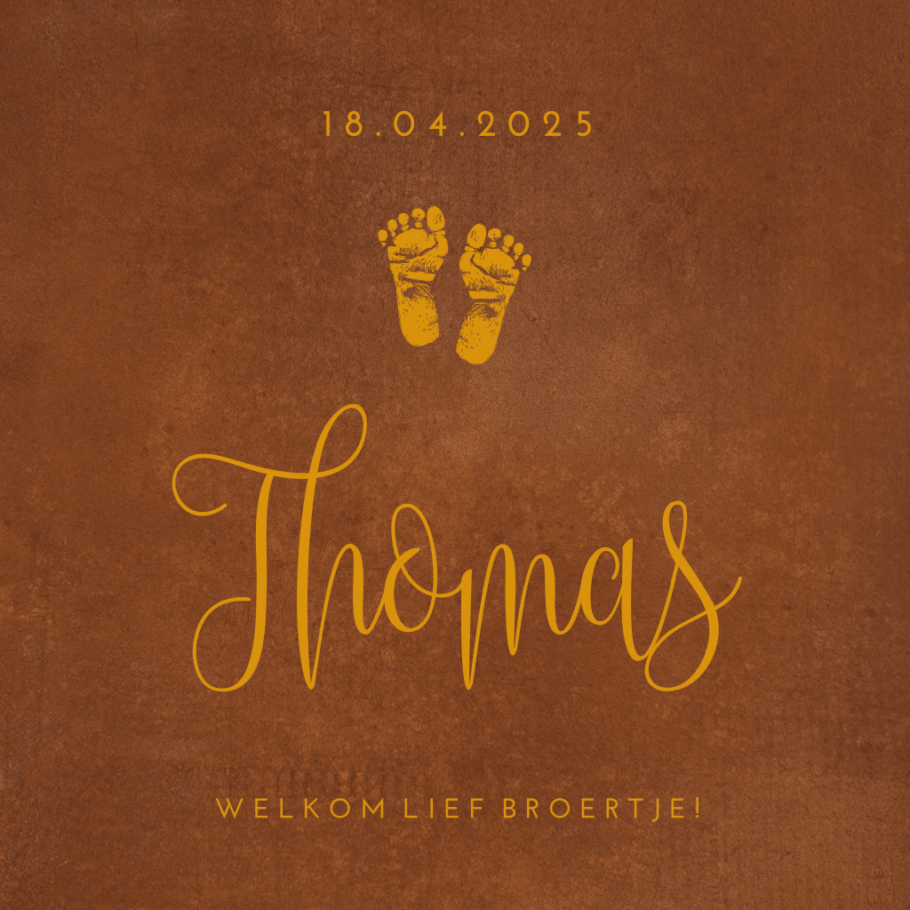 Een originele geboortekaart voor een zoon met een achtergrond in roestlook en okergele teksten en lieve babyvoetjes. Hoe heet jouw zoontje? Maak deze kaart zelf naar wens af!