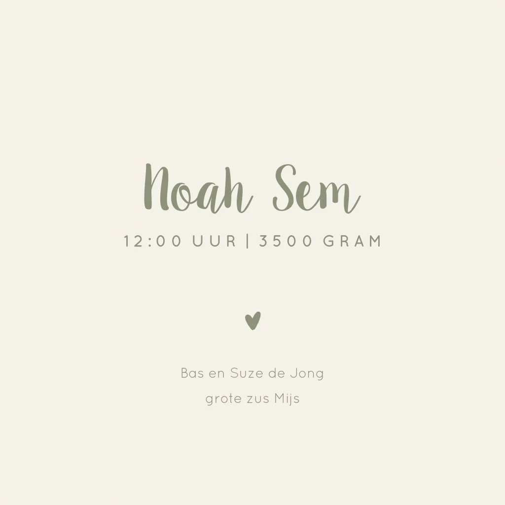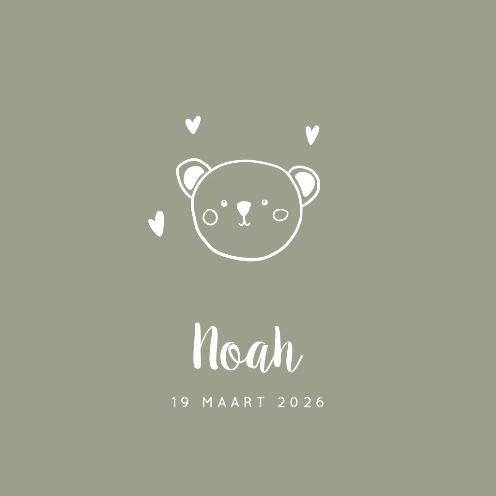 Kondig de geboorte van jullie zoon of dochter aan met dit mooie kaartje! Het kaartje het een groene achtergrond met de goudfolie opdruk van een beertje, hartjes, naam en geboortedatum. Dit kaartje kan helemaal naar wens aangepast worden in onze online editor.