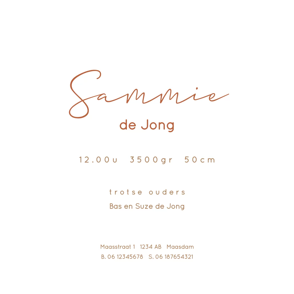 Dit is een schattig kaartje voor jullie pasgeboren zoon of dochter. In een herfstig landschap staat een klein vosje. De naam wordt gedrukt in hoogglans, net als een aantal vallende blaadjes. Ook zo'n fan van dit kaartje? Bestel een proefdruk en bewonder dit kaartje in het echt.
