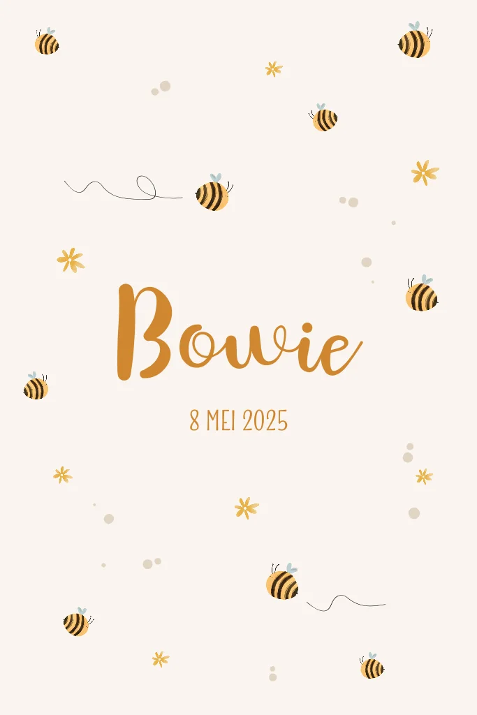 Een vrolijk geboortekaartje met bijtjes voor jullie toekomstige kleintje. Het kaartje heeft lieve illustraties van kleine bijtjes. Het kaartje kan je volledig personaliseren in onze online editor.