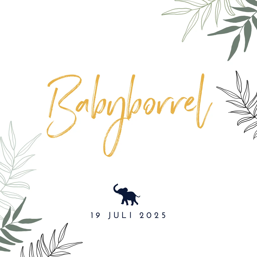 Stoere kraamborrel kaart voor bij het geboortekaartje van je zoontje met silhouet van olifantje en jungle bladeren.