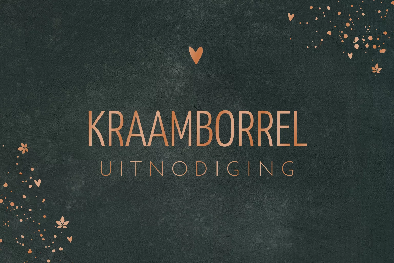 Stoere uitnodiging voor de babyborrel na de geboorte van jullie zoontje! Op de grijze velvet-look achtergrond staat 'kraamborrel' in hoogglans voor een extra luxe uitstraling. De hartjes, spetters en bloemetjes in koperkleur geven een feestelijk accent.