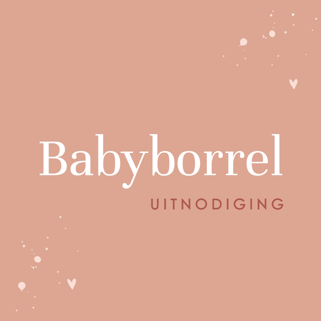 Nodig familie en vrienden uit voor het kraamfeest met deze bijpassende kraamborrelkaart in roze peach-kleur. In de afgeronde hoeken staan spetters en hartjes in zachtroze. 'Babyborrel' staat in roségoudfoliedruk, voor een extra luxe effect, chic!
