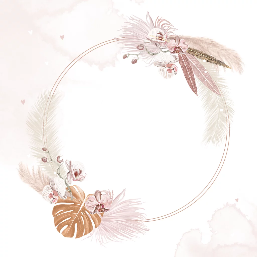 Romantische uitnodiging voor het kraamfeest na de geboorte van jullie dochter. Op een achtergrond van roze waterverf en hartjes een krans met bladeren en bloemen in bijpassende kleuren. De tekst is in roségoudfoliedruk, dat maakt de kaart extra luxe!