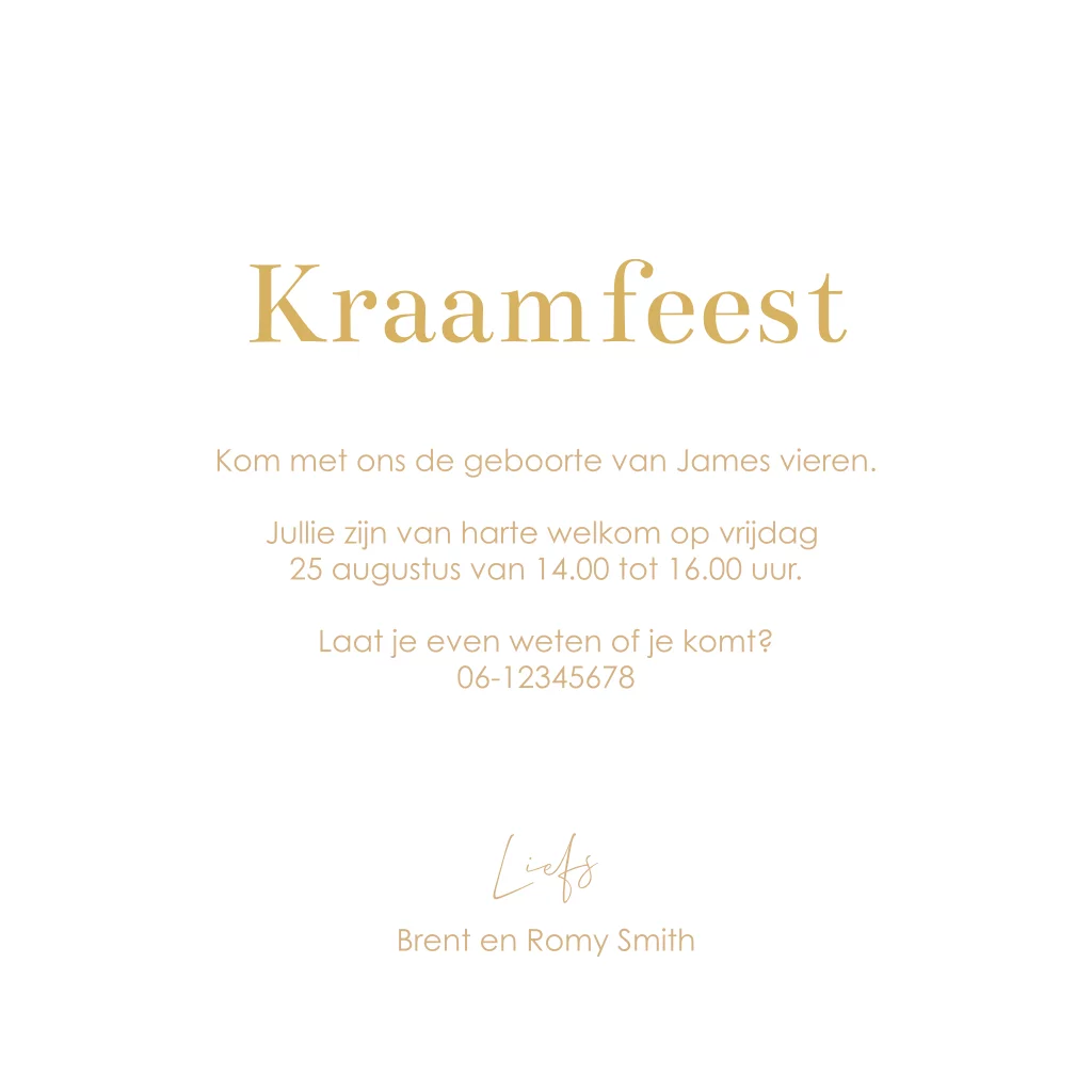 Bijpassende uitnodiging voor een babyborrel na de geboorte van jullie kindje, in de stijl van het geboortekaartje. De goudkleurige tekst maakt het compleet!