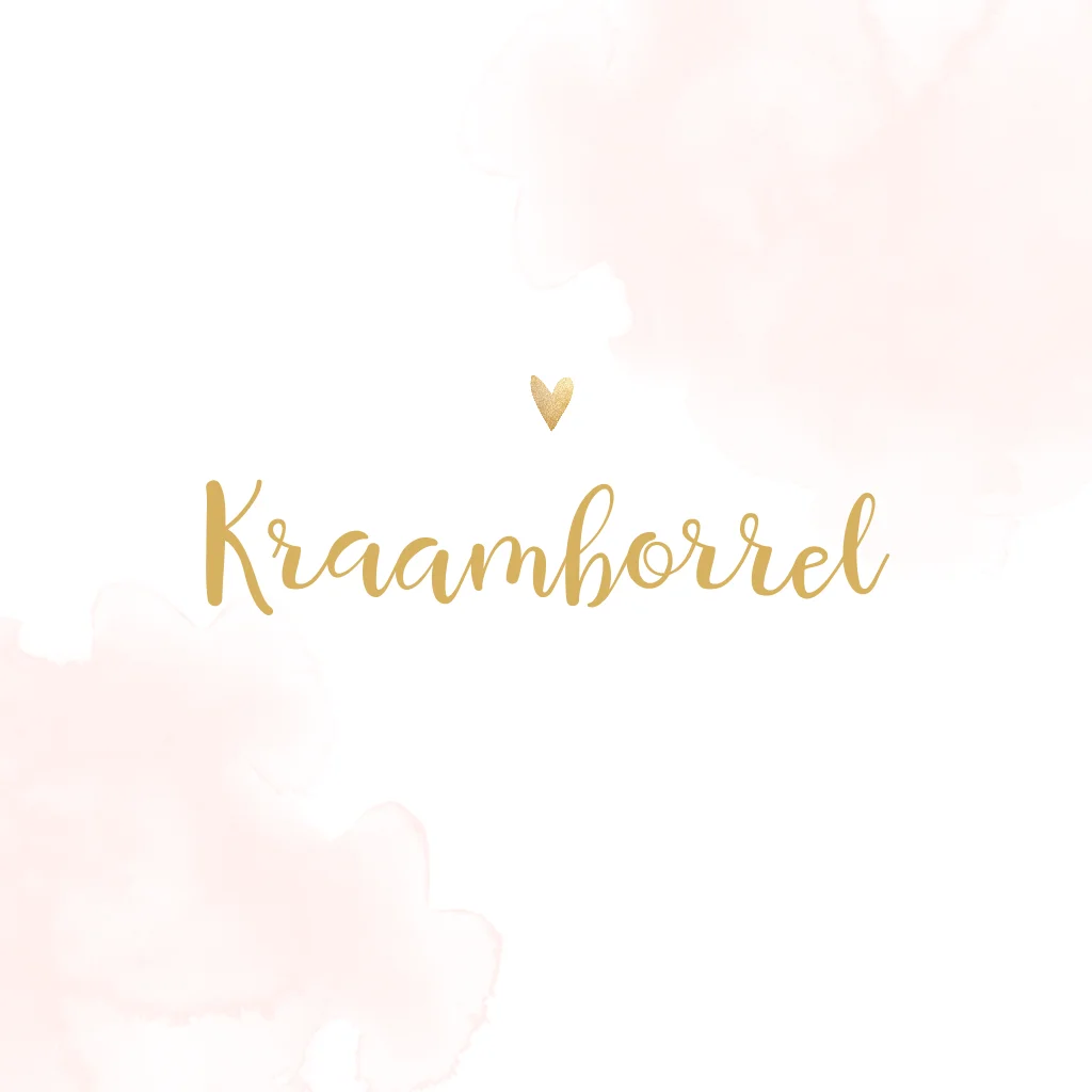 Een stijlvolle kraamborrel uitnodiging voor bij het kaartje. Het kaartje heeft een roze watercolour achtergrond met daarop goudkleurige letters. Pas het ontwerp naar wens aan in onze online editor.