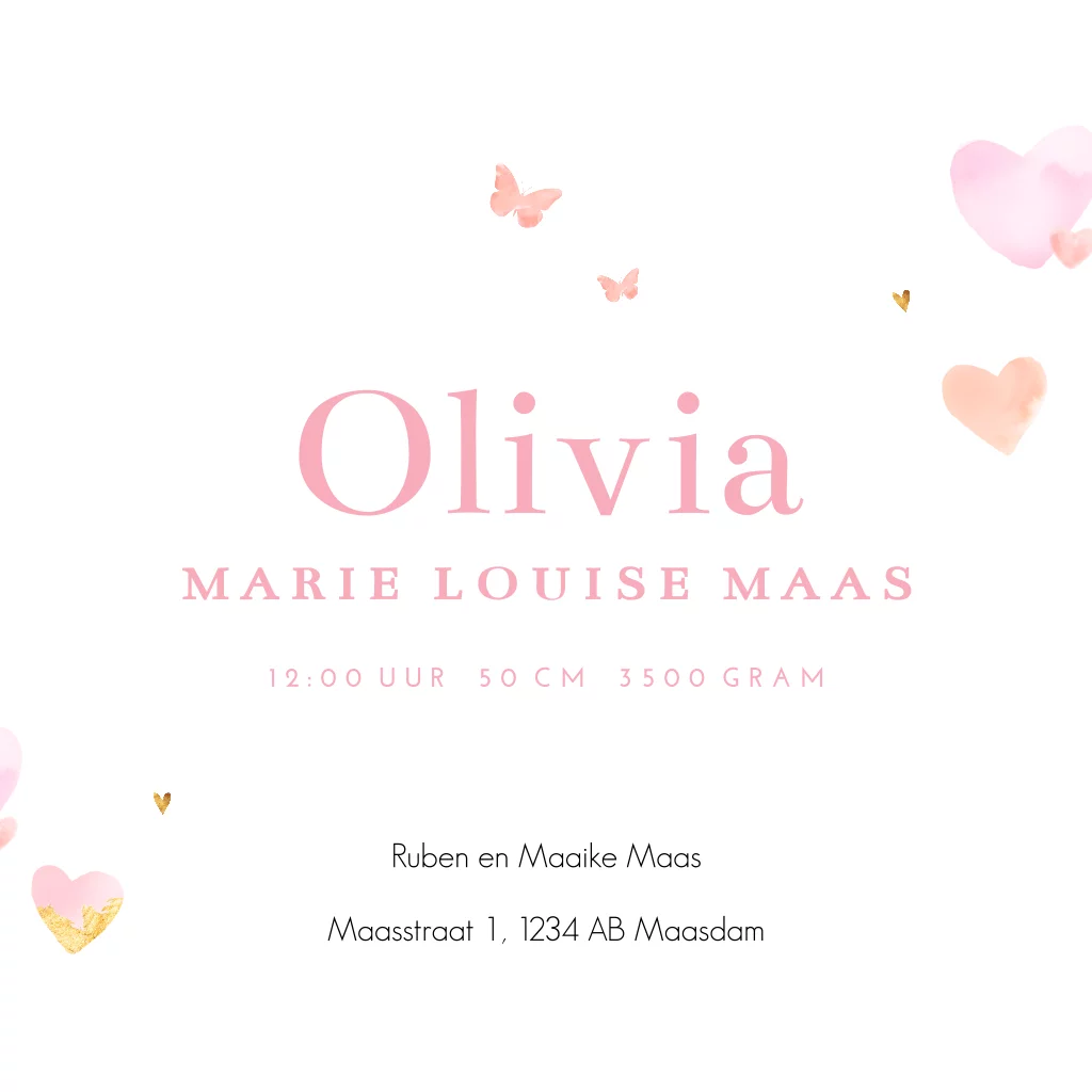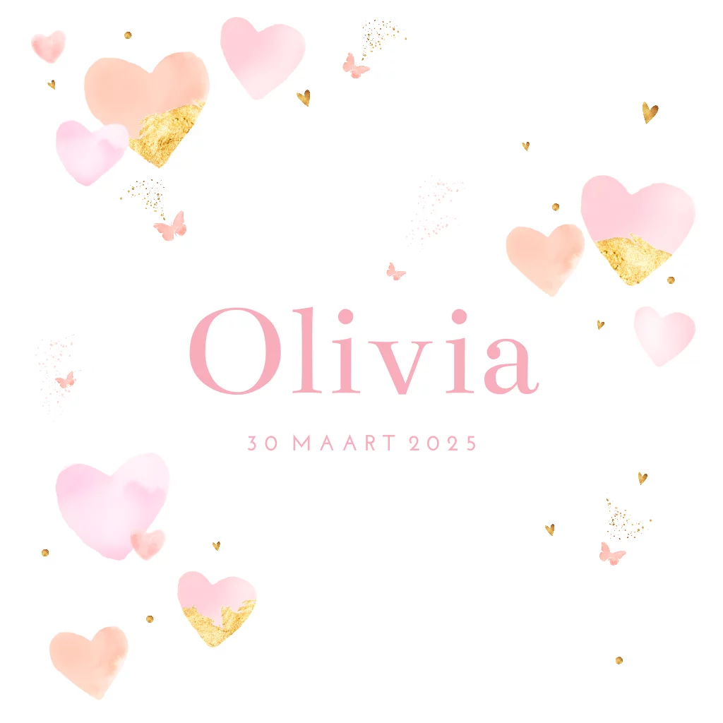 Een lief en hip geboortekaartje in peach en zachtroze met hartjes, kleine vlinders, stipjes en details in goudlook. Leuk voor een meisje! Aan de binnenkant kun je een eigen foto toevoegen. Tip: Prachtig op parelmoer papier en met een gouden envelop!