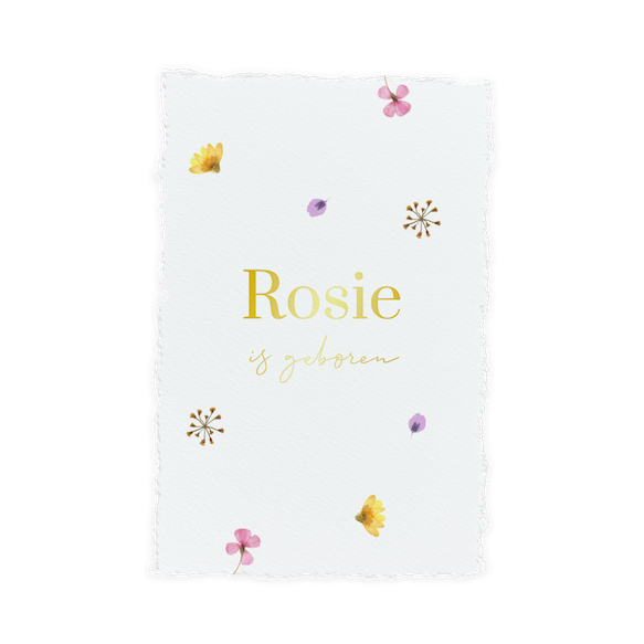 Dit is een mooi kaartje voor jullie pasgeboren dochter. Het kaartje heeft een lichte achtergrond met de kleurrijke illustraties van droogbloemen. Al onze kaartjes met handgeschept papier vind je hier.
