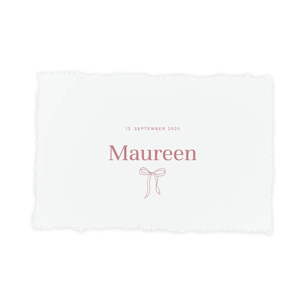 Een klassiek en stijlvol geboortekaartje! Het kaartje heeft een witte achtergrond met daarop de naam van jullie kindje en een sierlijke strik in oudroze. Boven de naam staat een klein hartje, lief! Het kaartje heeft een geschept papier look die je zelf aan het kaartje geeft. Al onze kaartjes met handgeschept papier vind je hier. Let hierbij op de volgende dingen: