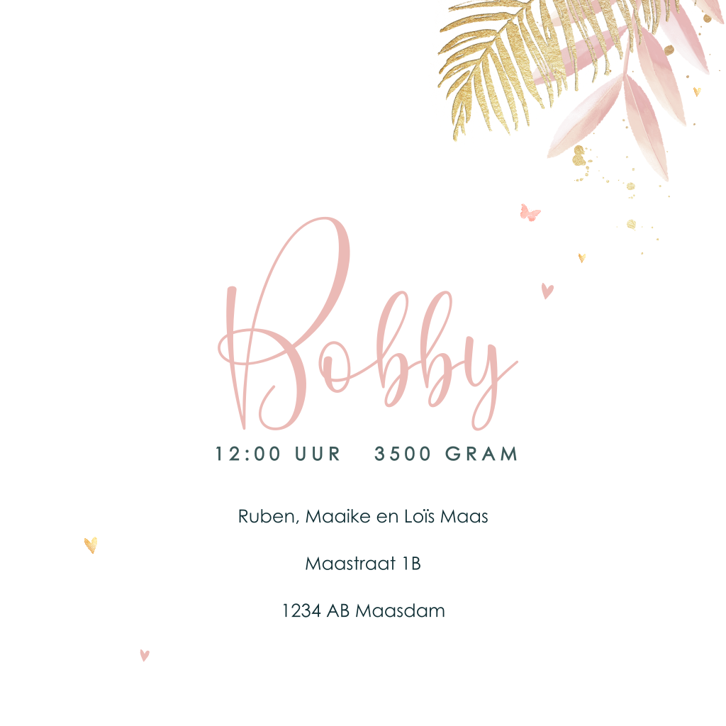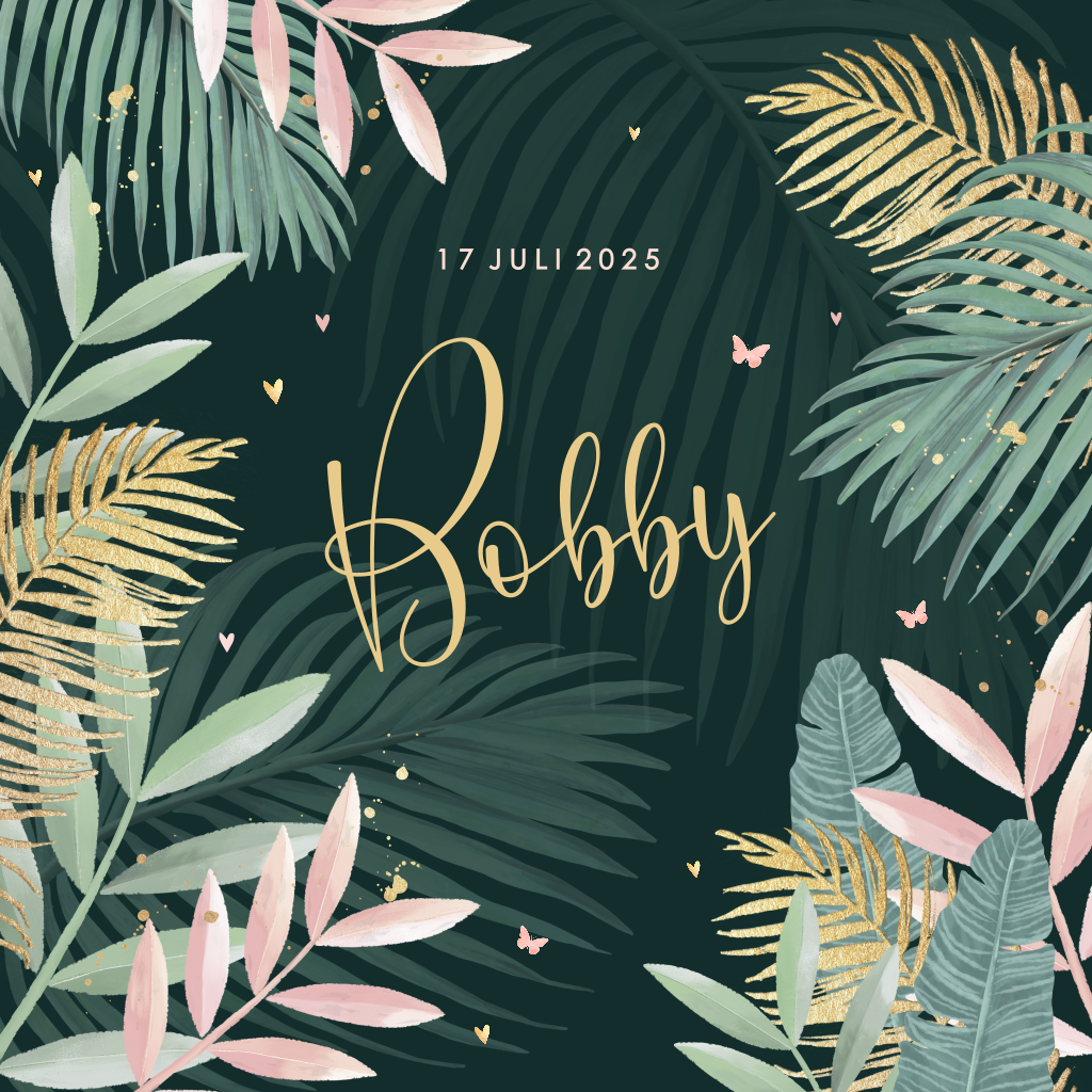 Trendy geboortekaartje voor je pasgeboren dochtertje met botanische bladeren in groen, roze en goudlook op een stoere groene achtergrond.