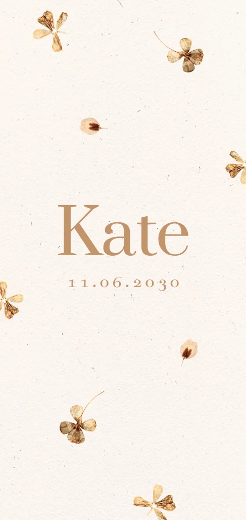 Dit is een prachtig geboortekaartje voor jullie dochter. Het kaartje heeft een lichte achtergrond met de illustraties van droogbloemen. Het kaartje kan naar wens aangepast worden in onze online editor.