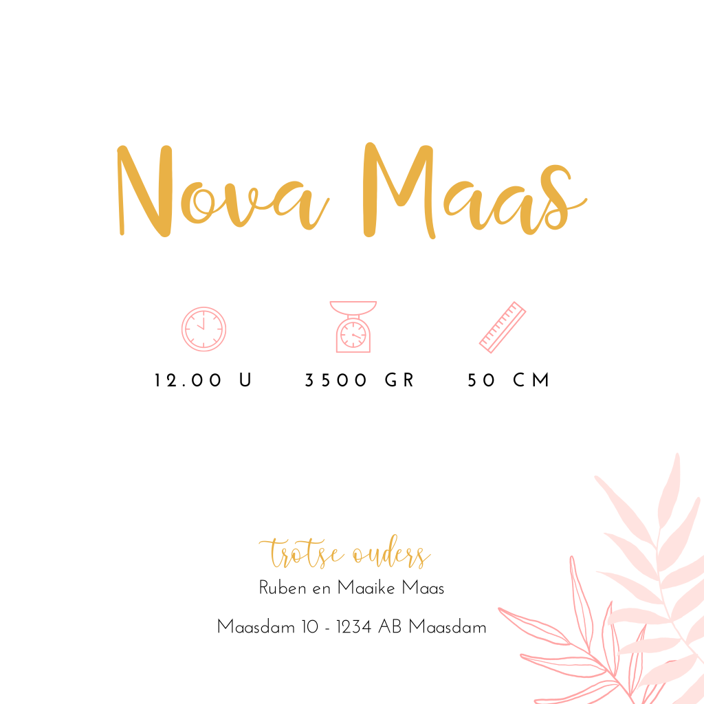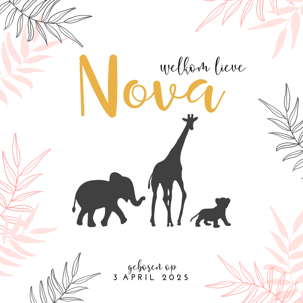 Stoer geboortekaartje meisje met jungledieren silhouet en bladeren