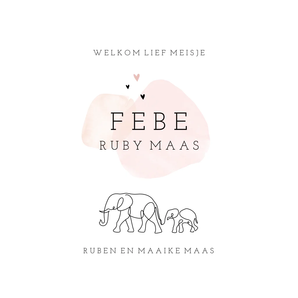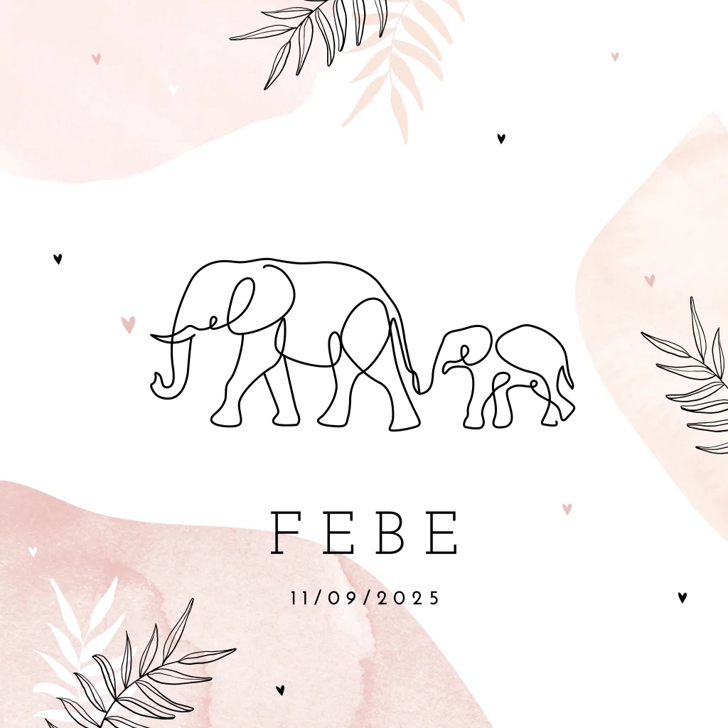 Trendy geboortekaartje voor de geboorteaankondiging van je dochter met roze waterverf vlekken en hippe takjes. De lijntekening van twee olifantjes maken dit jungle geboortekaartje helemaal af!