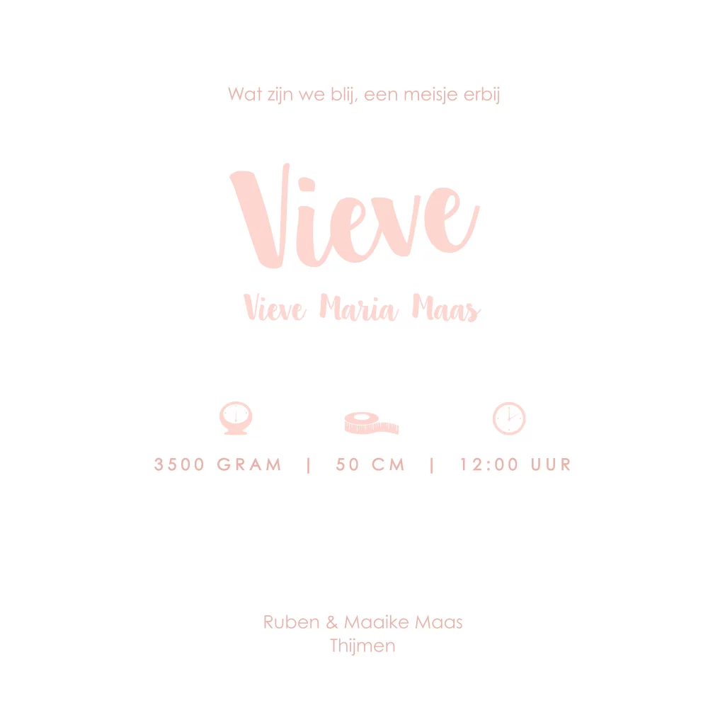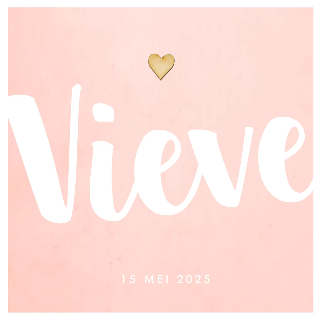 Een lief babykaartje meisje in roze met de naam groot op de voorzijde. Het houten hartje maakt de kaart extra bijzonder. Mooi op oud-hollands papier in combinatie met zand kleur envelop!