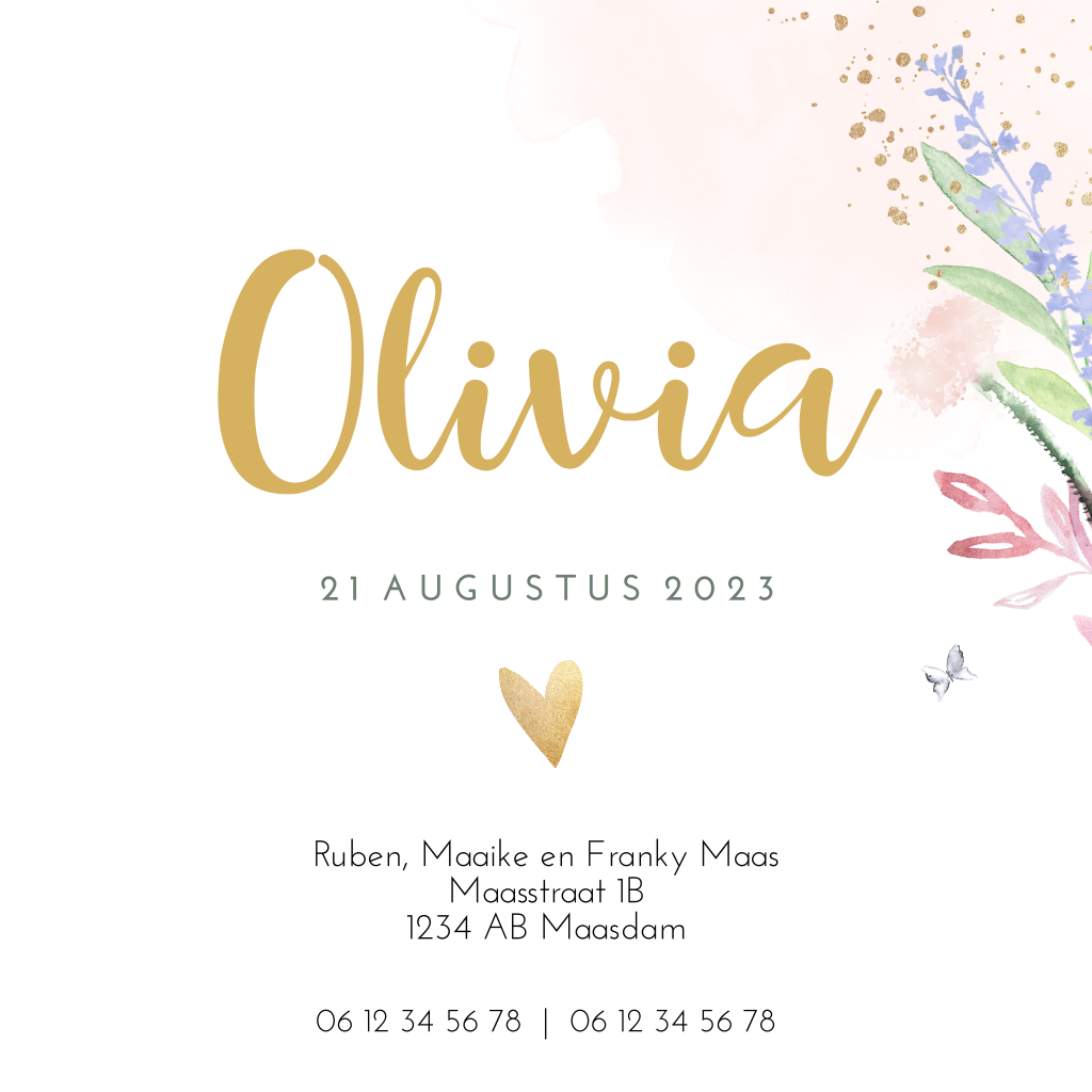 Wordt jullie dochtertje geboren in de zomer? Dan is dit het perfecte kaartje voor haar! De trendy bloemen en gouden details zorgen voor een zomerse look.