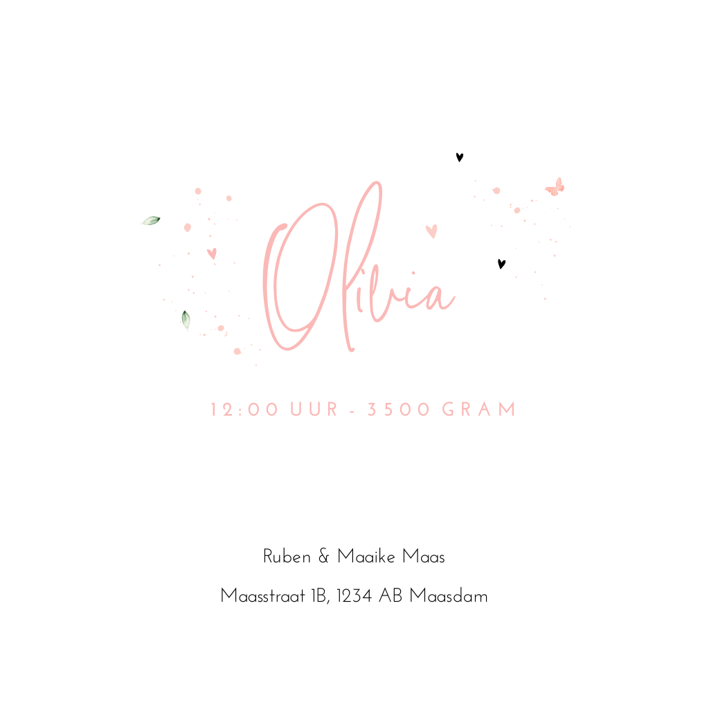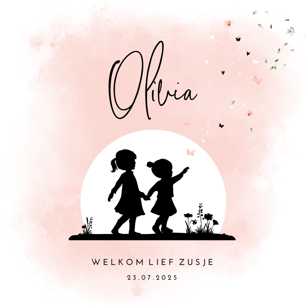 Schattig geboortekaartje voor je tweede dochtertje met een silhouet van een baby zusje en haar grote zus op een achtergrond met roze watercolor en vlindertjes en bladertjes.