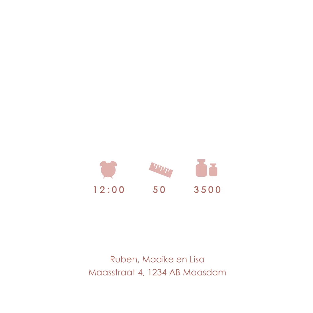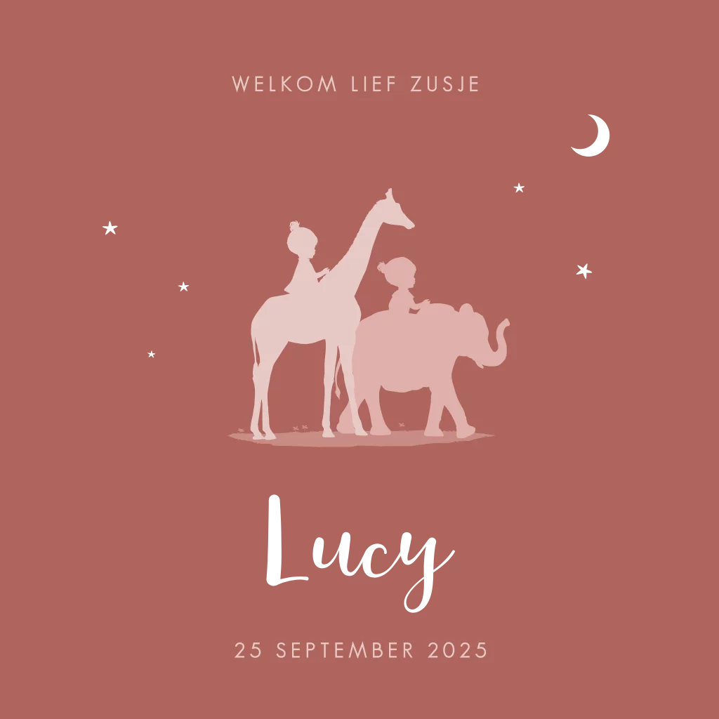 Een lief en vrolijk geboortekaartje voor jullie tweede kindje. Het kaartje heeft een roze achtergrond. Op het kaartje zie je twee silhouetjes op een olifant en giraf zitten. De naam wordt gedrukt in roségoudfolie.