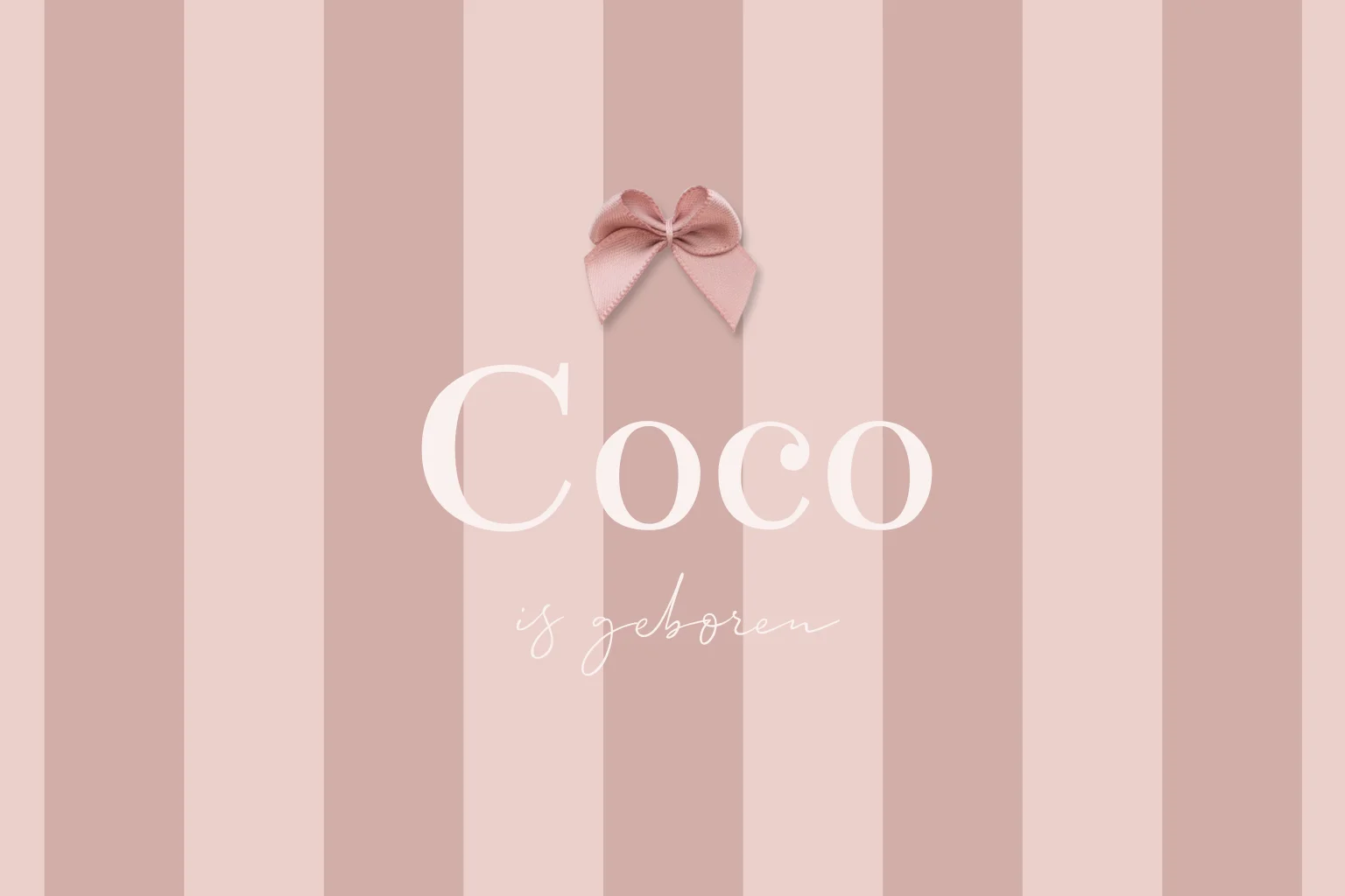 Een gestreept klassiek geboortekaartje voor jullie meisje. Het kaartje heeft roze en oud roze strepen en heeft boven de naam een echt satijnen strikje. Het strikje voegt echt dat beetje extra toe aan het kaartje.
