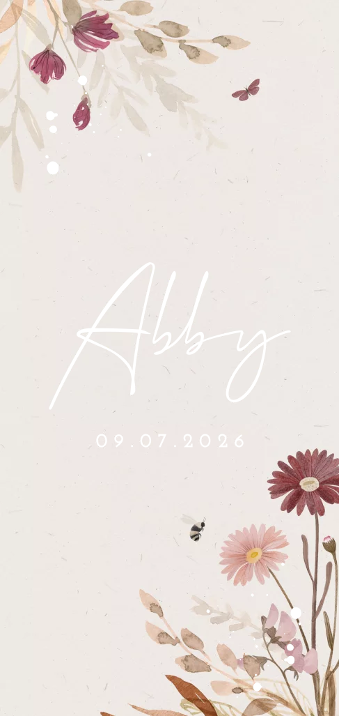 Dit is een luxe geboortekaartje voor jullie dochter. De naam en geboortedatum worden centraal op het kaartje gedrukt in roségoudfolie. De getekende bloemen geven dit kaartje een kleurrijke uitstraling. Pas het kaartje naar wens aan in onze online editor en bestel een proefdruk om dit kaartje in het echt te zien.