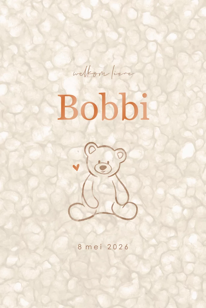 Dit is een lief geboortekaartje voor jullie zoon of dochter. Het kaartje heeft een teddy-look achtergrond. Centraal op het kaartje staat de lijntekening van een beertje. De naam en het kleine hartje worden gedrukt in hoogglans.