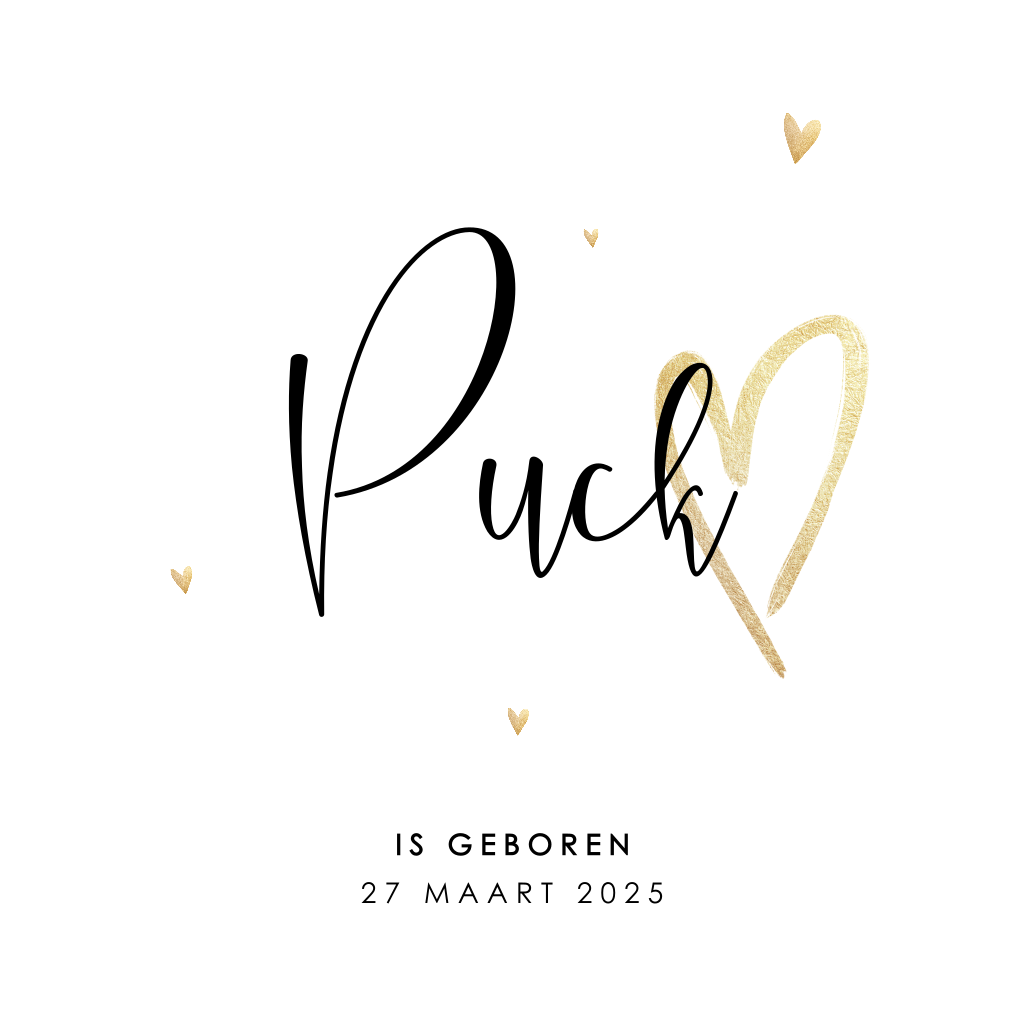 Schattig neutraal geboortekaartje in het wit met hartjes. Toch liever een ander kleurtje? Pas het gemakkelijk aan in onze editor.