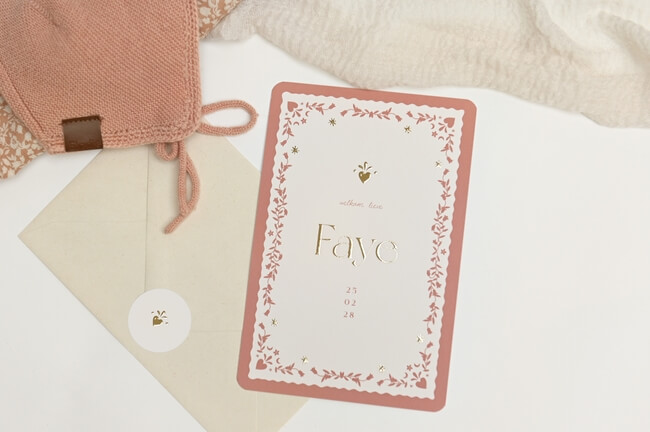 Geboortekaartje voor een meisje met een romantische rand van bloemen. De kaart heeft een stijlvolle rood/roze kleur. De naam van jullie meisje is gedrukt in goudfolie. Pas dit kaartje volledig naar wens aan in onze online editor. #faye