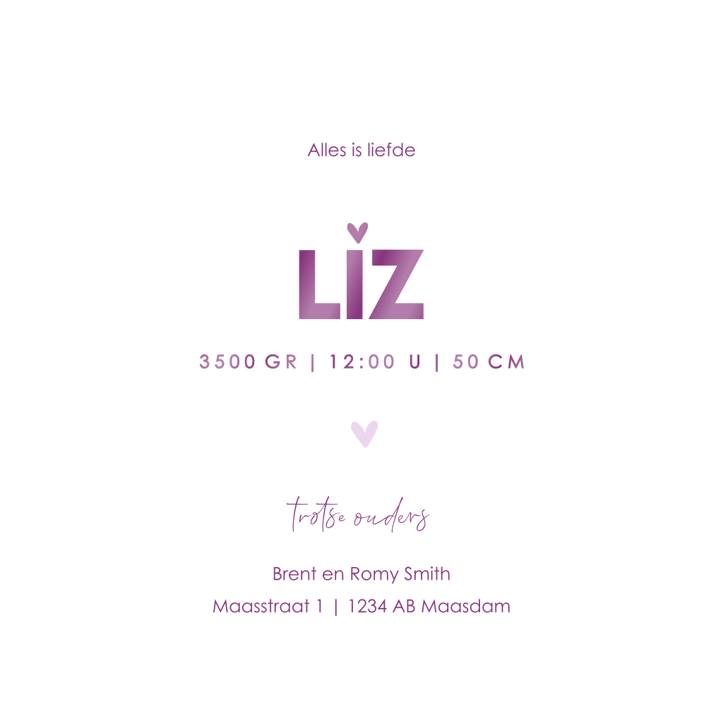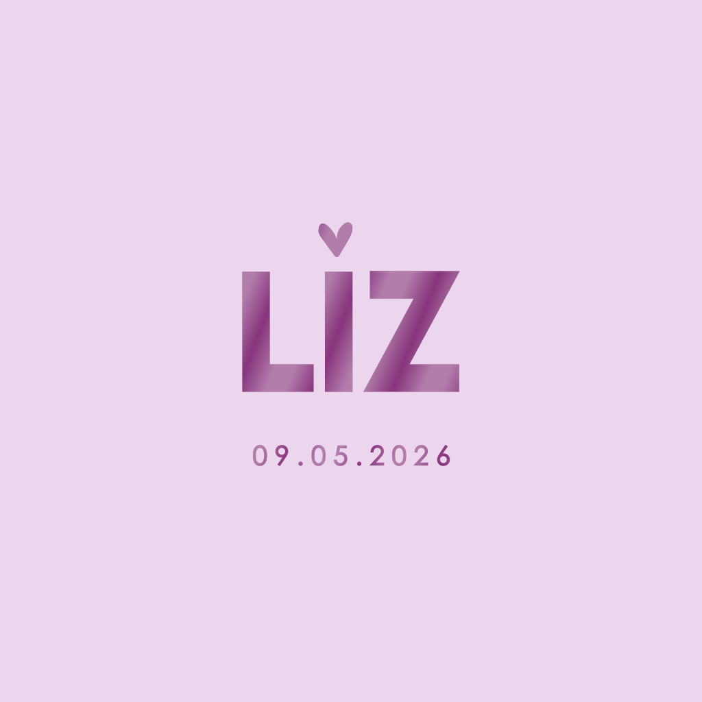 Een hip geboortekaartje voor jouw kindje. Het kaartje heeft een lila achtergrond met daarop paarse hoogglans. De letters en het hartje komen door deze paarse hoogglans prachtig naar voren. Pas het kaartje naar wens aan in onze online editor.