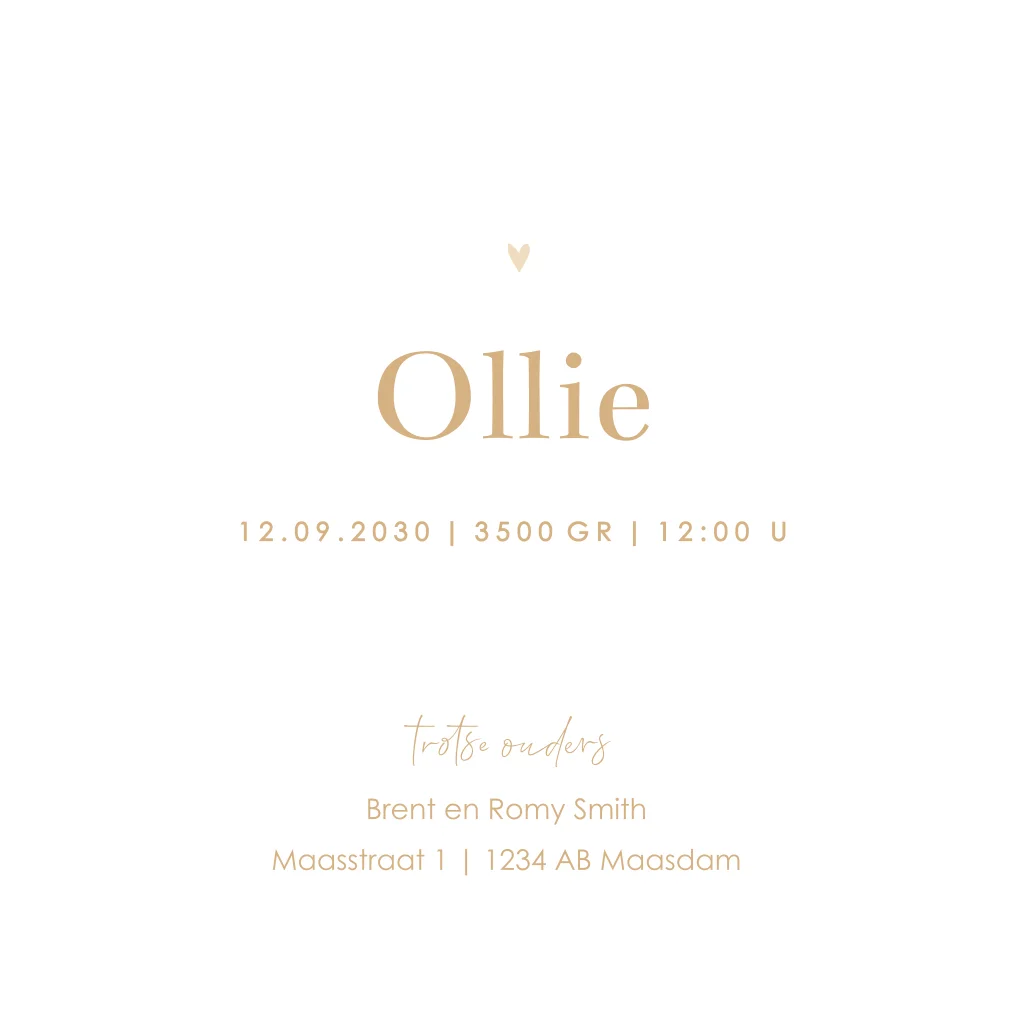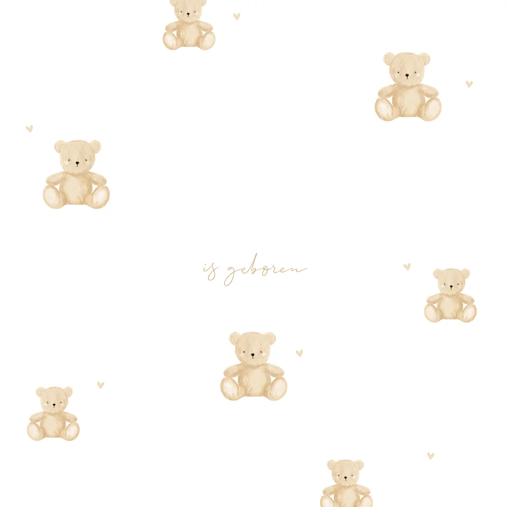 Kondig de geboorte van jullie zoon of dochter aan met dit lieve kaartje. Op het kaartje zijn de kleine illustraties van teddyberen te zien. De goudfolie opdruk geeft dit kaartje een luxe effect. Benieuwd naar dit kaartje? Bestel een proefdruk en bewonder dit kaartje in het echt!