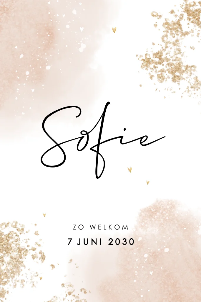 Dit is een mooi geboortekaartje voor jullie dochter. Het kaartje heeft een lichtroze watercolour actergrond. De spetters en hartjes in wit- en goudkleur maken dit kaartje extra feestelijk. De ronde hoeken maken dit kaartje helemaal compleet. Bestel snel een proefdruk om dit kaartje in het echt te zien!