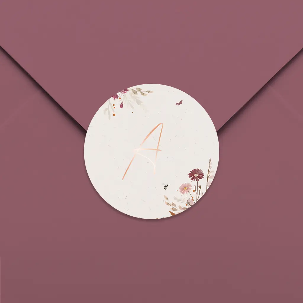 Een prachtige sluitsticker voor bij het geboortekaartje. Deze sticker heeft illustraties van verschillende bloemen. In het midden staat het initiaal van jullie kindje in roségoudfolie. De sticker is naar wens aan te passen in onze online editor.