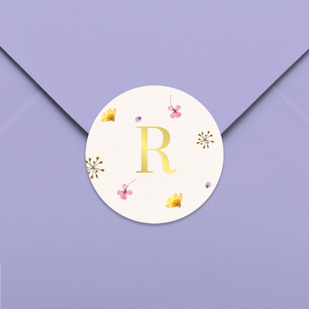 Sluitsticker met gedroogde bloemen en goudfolie initiaal