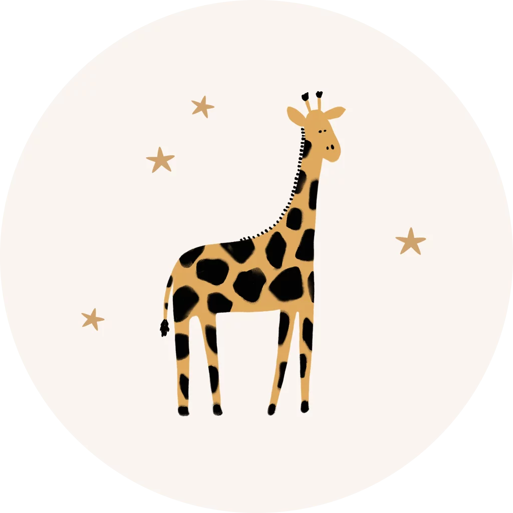 Met deze grappige sluitsticker maak je de envelopjes van het geboortekaartje gemakkelijk dicht en wordt het ook nog eens een mooi geheel met het vrolijke jungledesign van het geboortekaartje. De giraffe in geel en zwart staat onder de sterrenhemel te dromen, lief!