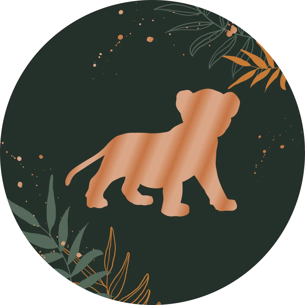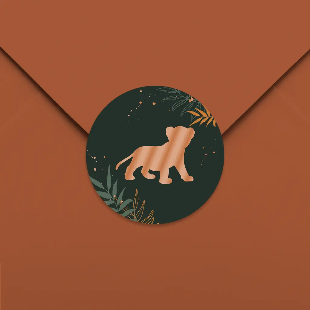 Maak het geboortekaartje compleet met deze bijpassende sluitzegel in junglestijl. Een lief leeuwtje in koperfoliedruk loopt tussen de bladeren, stoer!