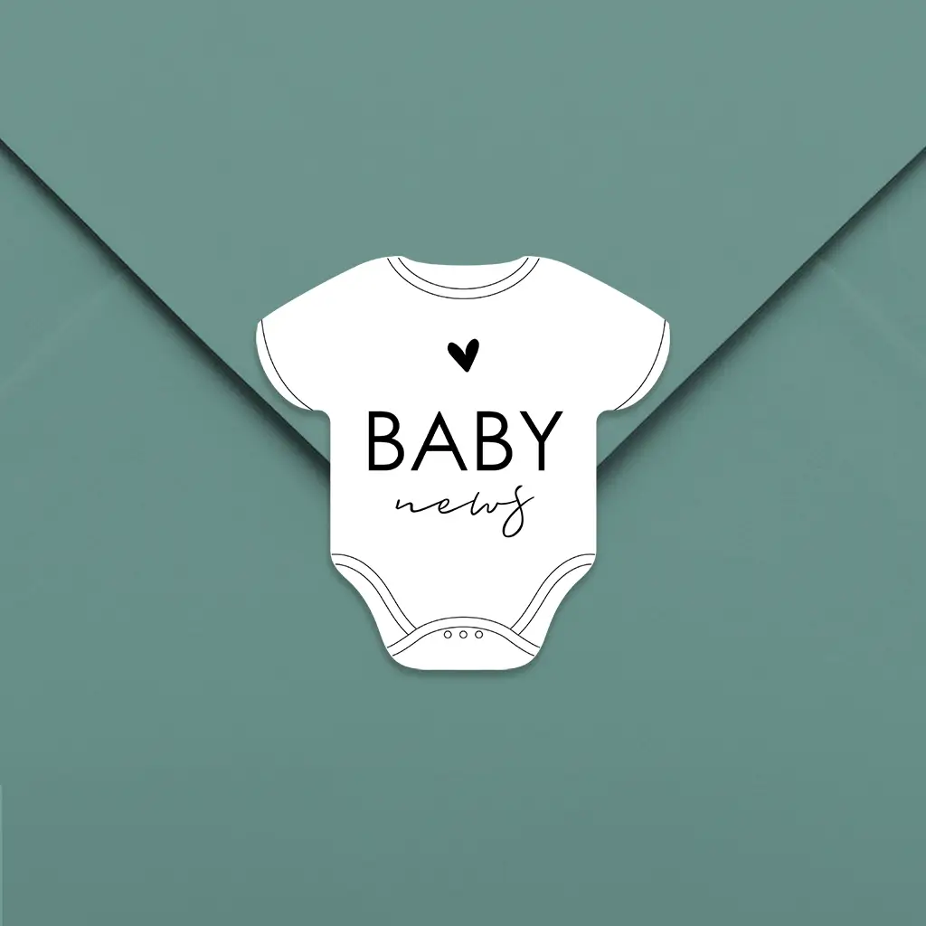 Deze sluitsticker heeft de vorm van een romper. Op het rompertje staat een hartje met de tekst 'baby news'.