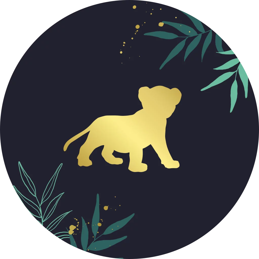 Maak het geboortekaartje compleet met deze sluitsticker op de enveloppe, stoer! Op een donkerblauwe achtergrond loopt een welpje van goudfolie tussen de groene bladeren.
