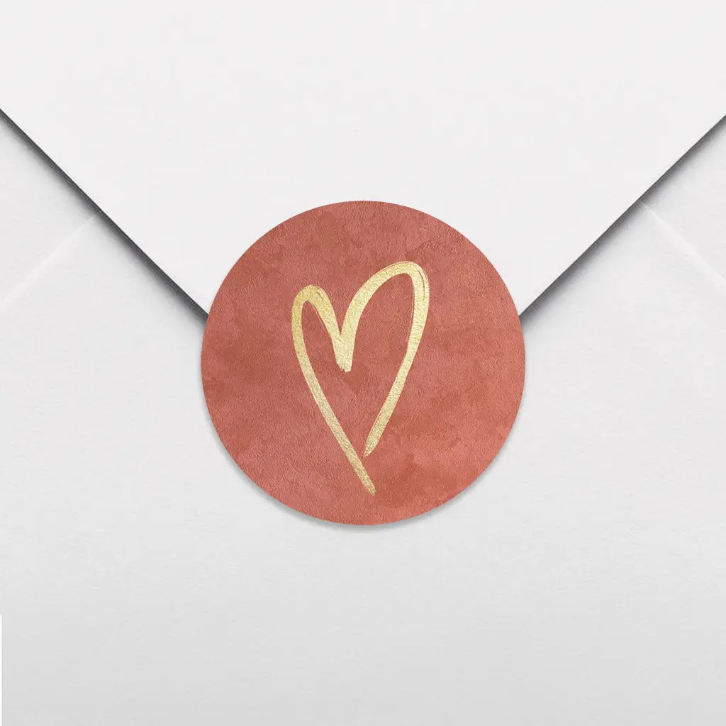 Mooie sluitstickers bij het stoere geboortekaartje van een meisje, een gouden hart staat op een roodbruine velvet-look achtergrond.