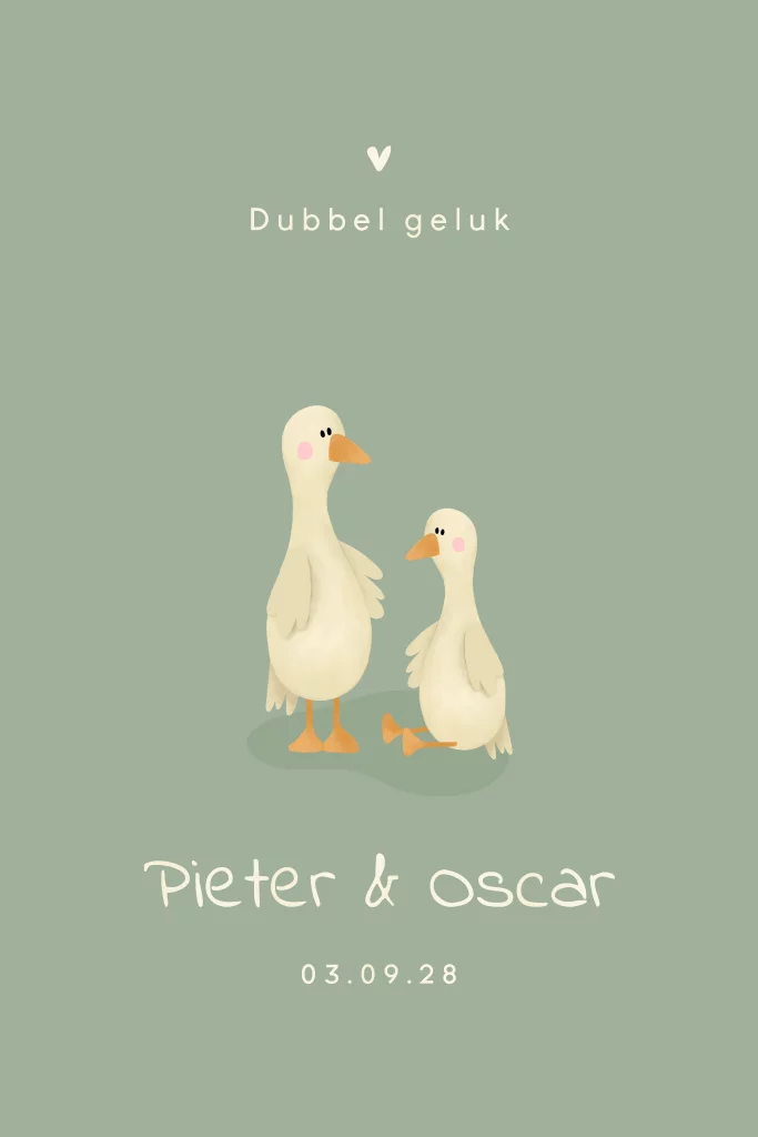 Een lief groen geboortekaartje voor een tweeling. Op het kaartje zie je een illustratie van twee lieve eendjes. Pas het kaartje naar wens aan in onze online editor en bestel een proefdruk om dit kaartje in het echt te zien!