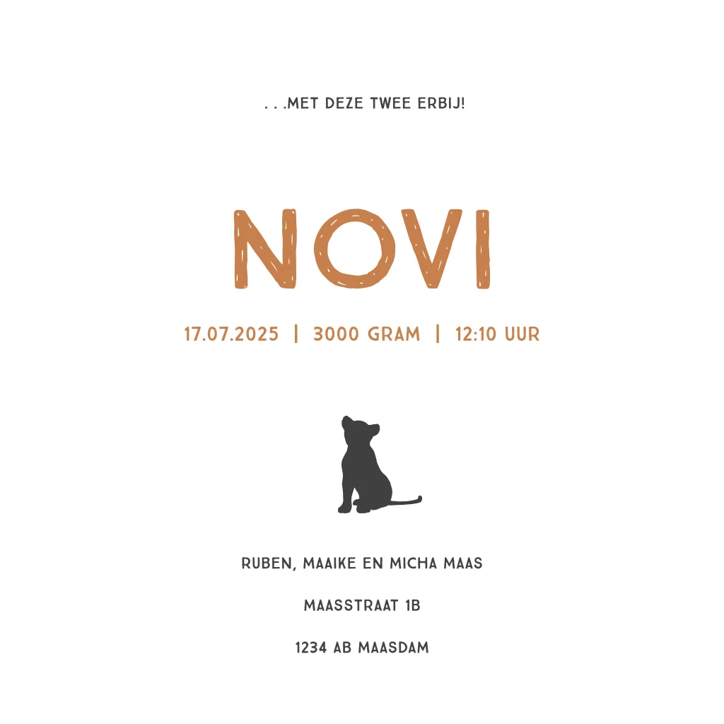 Kondig de geboorte van jullie tweeling aan met dit stoere geboortekaartje is Lion King thema. De twee welpjes zijn zowel stoer als schattig. Pas kleuren en elementjes zelf eenvoudig aan.